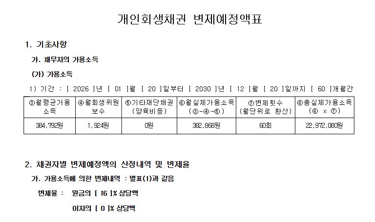 총변제되는 금액은 22,972,080원, 변제율은 원금의 16% 상당액으로 개시결정 받은 사건입니다.